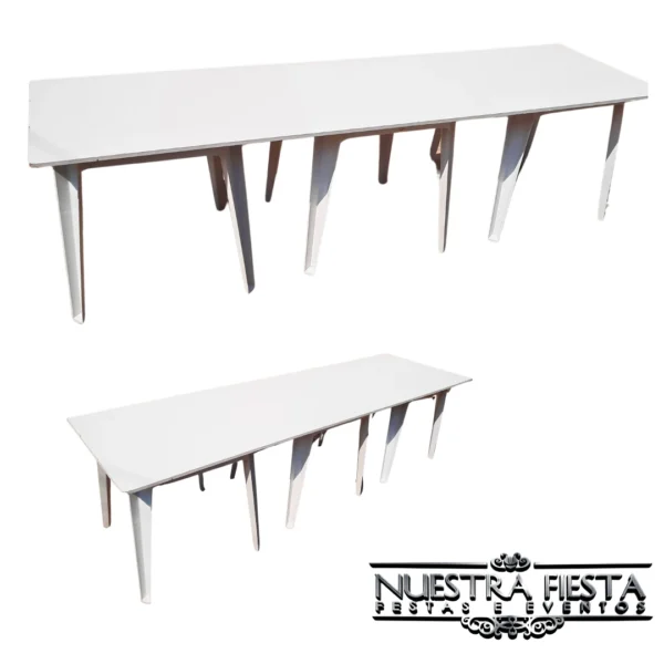 O Aluguel de Mesa Pranchão Retangular é um dos serviços mais procurados da Nuestra Fiesta, especialmente para eventos que contam com um grande número de convidados. Tradicionalmente, as mesas pranchão eram feitas de madeira e suportadas por cavaletes, mas hoje utilizamos placas de MDF brancas apoiadas em mesas de plástico, que oferecem uma combinação ideal de modernidade e funcionalidade.